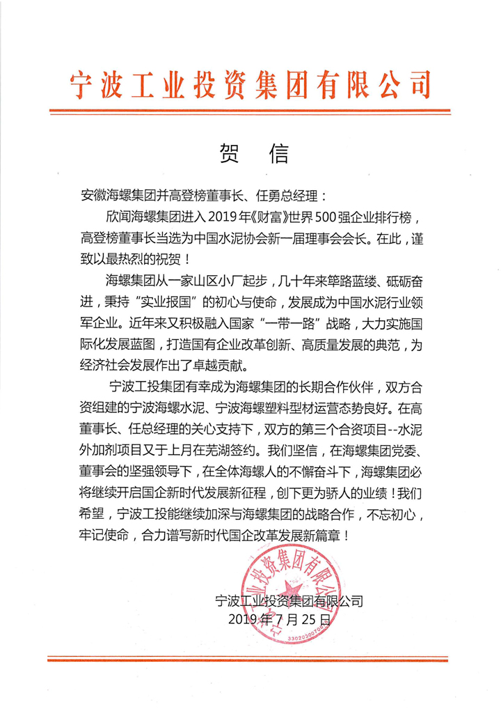 寧波工投致海螺集團(tuán)并高登榜董事長、任勇總經(jīng)理賀信