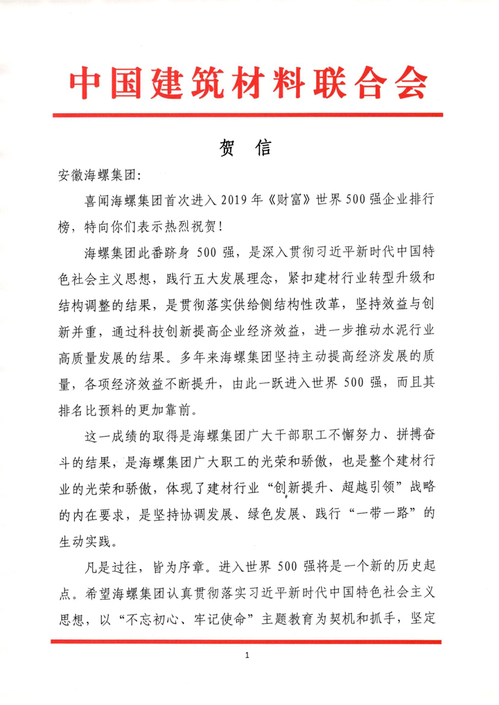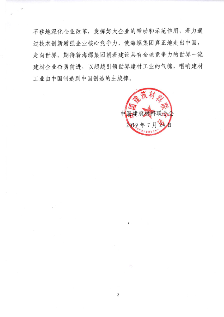中國建筑材料聯(lián)合會致海螺集團賀信